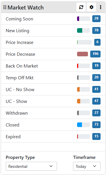 The Market Watch Widget is similar to the Hot Sheets widget, in that it tracks recent changes to listings. This tool always tracks all of the listed changes for each property category. Each category can save customized critieria, unique to that category. Unlike the Hot Sheets, this tool can only have one search per category, and must have one search for each category. To set criteria, select the property category from the drop down menu at the bottom left of the tool, then click the "Customize" button (the "gear" icon) at the top right. This tool has four time range options that can search for changes as well: