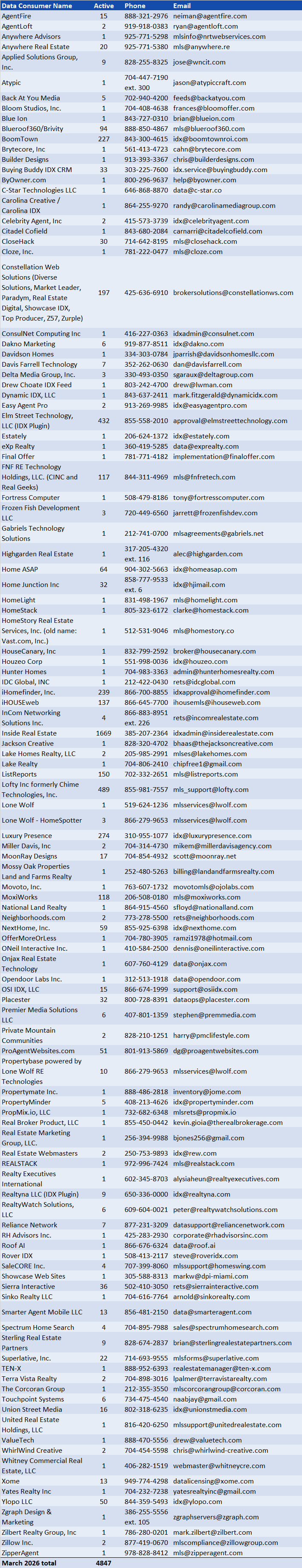 This vendor list features 116 vendors delivering services to over 4,800 websites for Canopy MLS members. When choosing a data technology vendor from the list below, consider selecting one that serves multiple clients, as this may indicate broader experience and capabilities. Vendors supporting only a single website may be offering in-house or limited-use services.