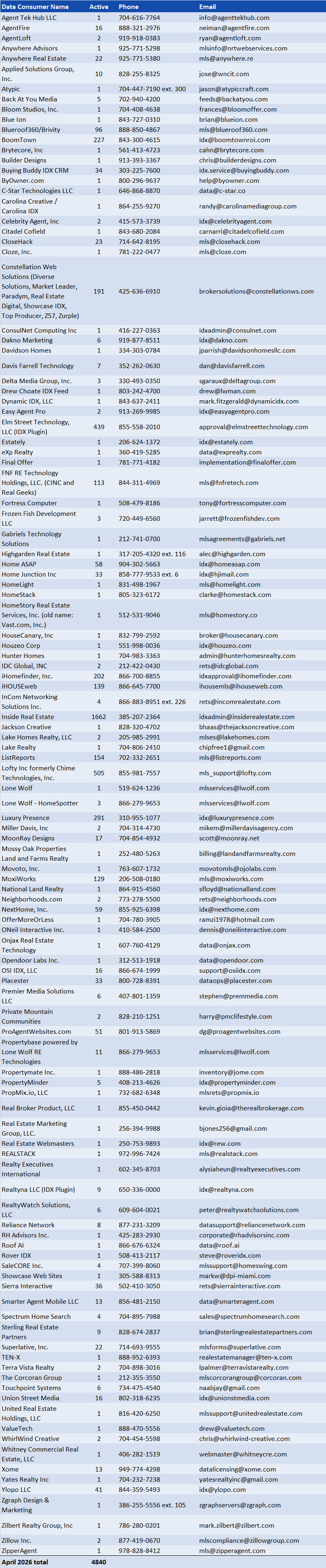 This vendor list features 116 vendors delivering services to over 4,800 websites for Canopy MLS members. When choosing a data technology vendor from the list below, consider selecting one that serves multiple clients, as this may indicate broader experience and capabilities. Vendors supporting only a single website may be offering in-house or limited-use services.